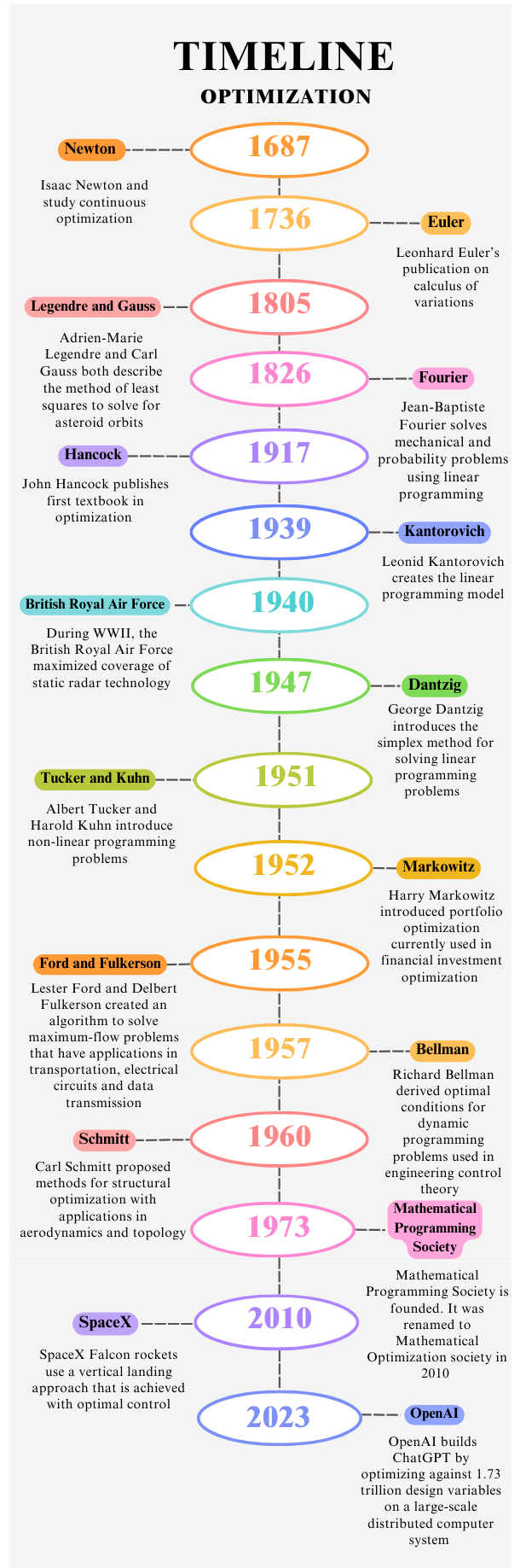 Presently, optimization is an ever-growing field with numerous practical applications, ranging from mathematics and engineering to economics and marketing. A current and widely known example of a system using optimization to function is ChatGPT. The generative artificial intelligence uses various techniques to comb through mass amounts of data and outputs answers quickly. Essentially, ChatGPT operates using optimization by reducing the time taken to provide an answer to the user. For a more detailed review of notable events in optimization history, you can look at the timeline in the image below.